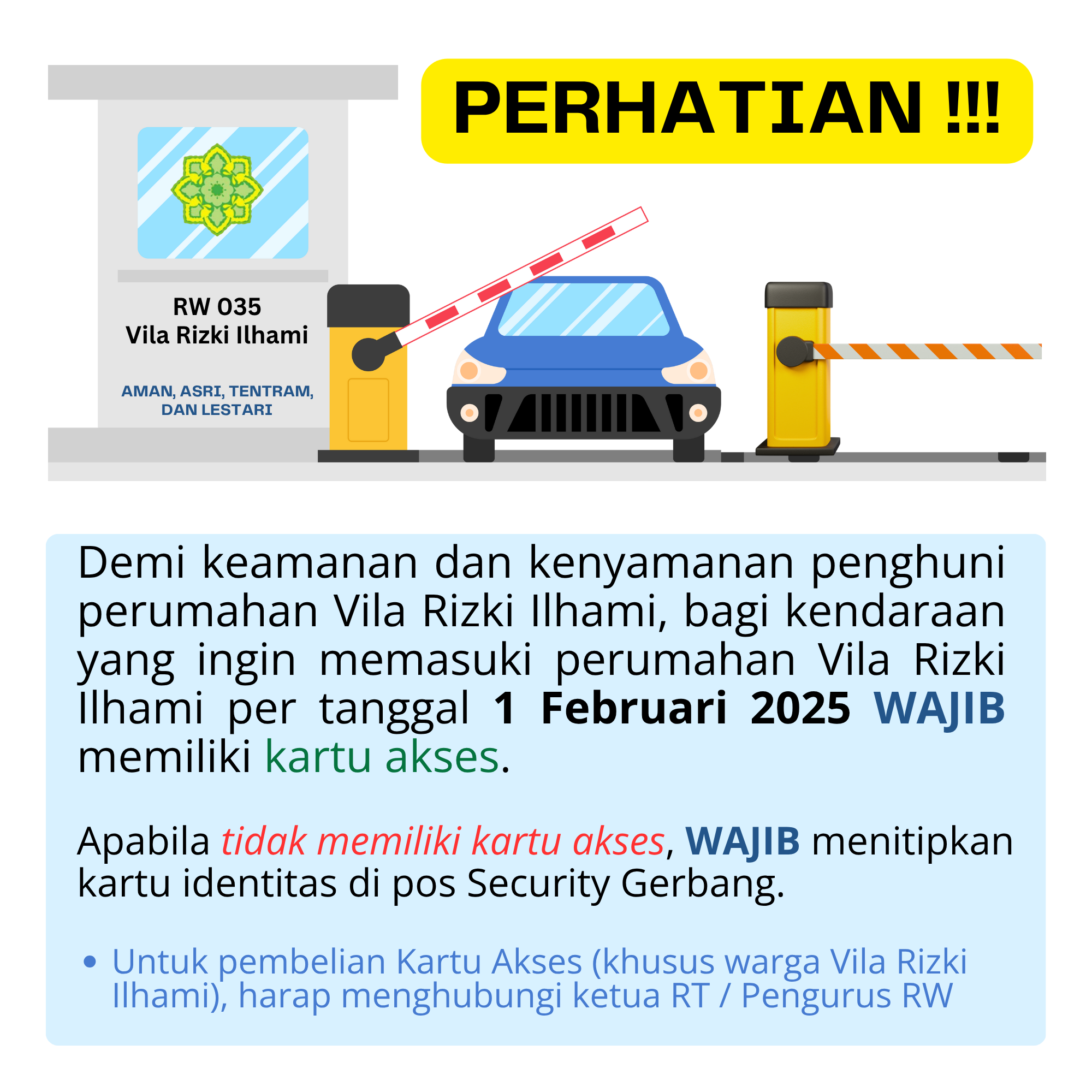 Demi keamanan dan kenyamanan penghuni perumahan Vila Rizki Ilhami, bagi kendaraan yang ingin memasuki perumahan Vila Rizki Ilhami per tanggal 1 Februari 2025 WAJIB memiliki kartu akses.